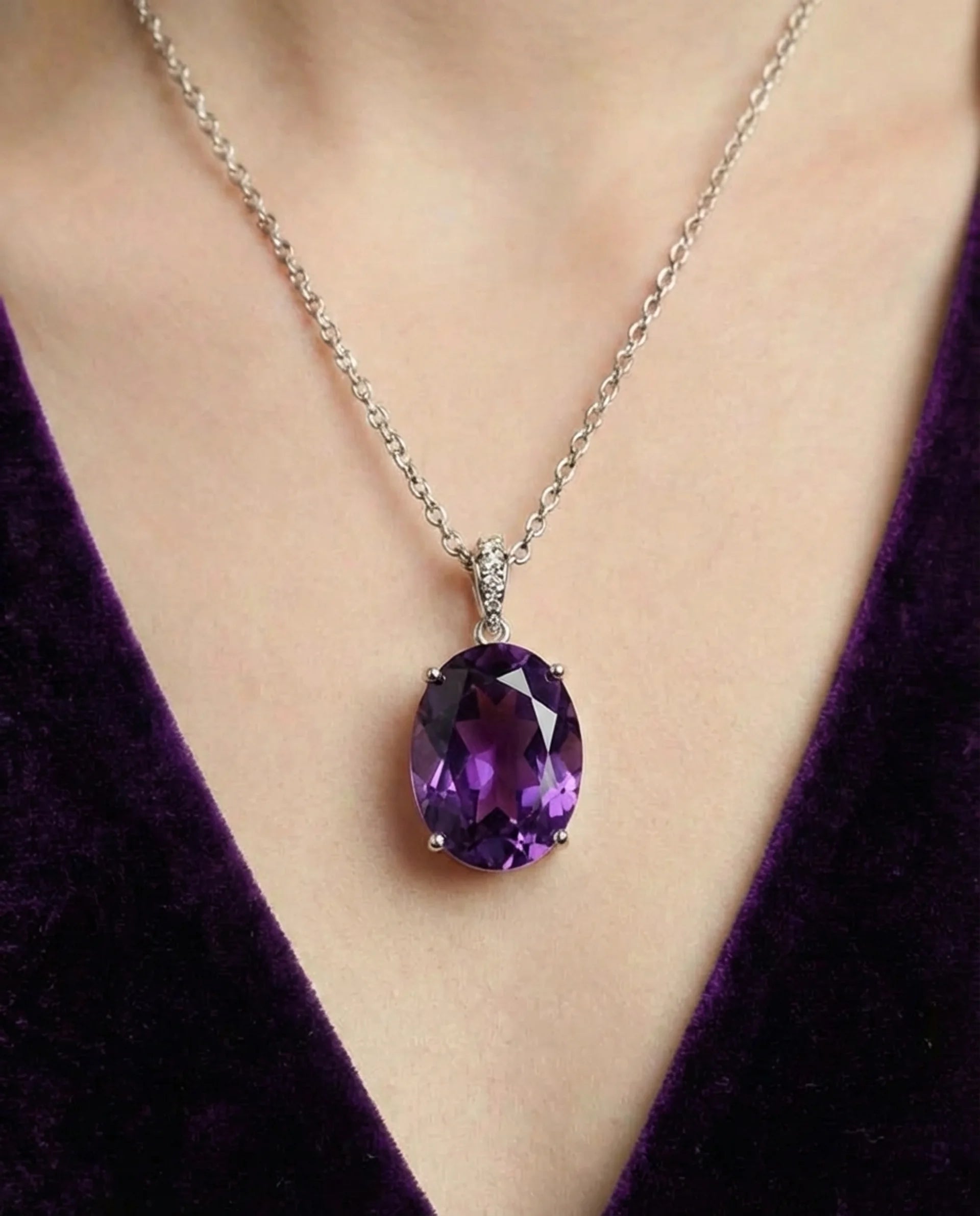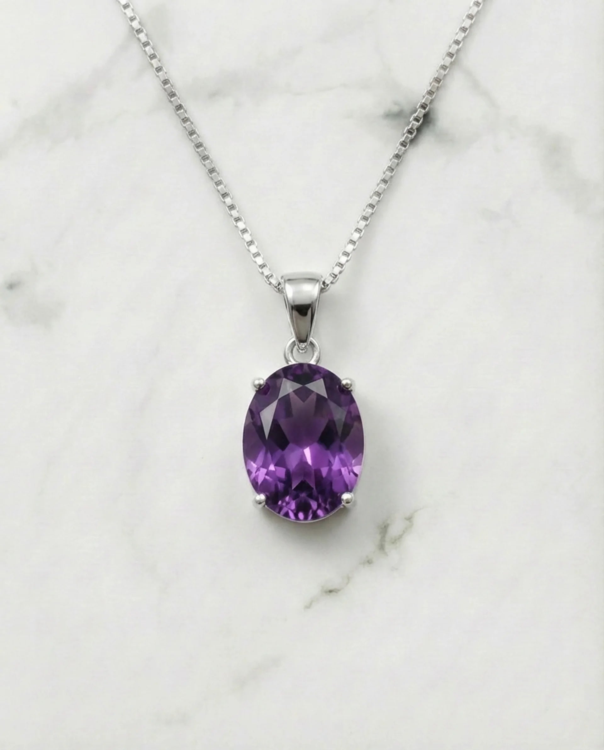 Dette ekte ametystkjedet har en ekte ovalslipt ametyst i rike lilla toner. Steinen er satt i et elegant anhengsdesign som fremhever ametystens naturlige klarhet og dype tistelfarger.